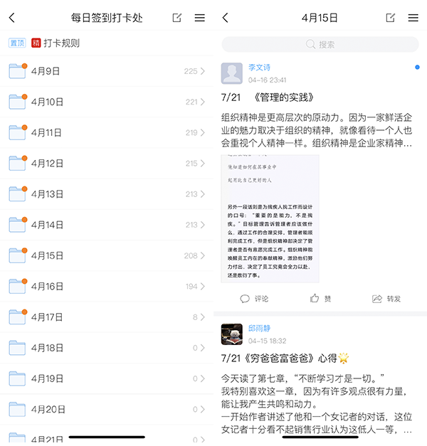 在行为心理学中,把一个新习惯的形成和巩固至少需要21天的现象称为“21天效应”。图书馆主办本次活动也围绕“21天打卡阅读”为核心,通过让学生连续21天阅读打卡,激发阅读兴趣,培养阅读习惯,转被动阅读为主动阅读。经济学院的陈同学在小组留言:以前很爱借书,但从未读完过,一直觉得是没时间,但通过这次活动强迫自己阅读记录,发现所谓的“没时间”不过是不愿行动的借口罢了,感谢图书馆携手学院开展的活动,让她重新发现文字的魅力。